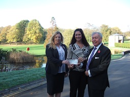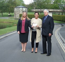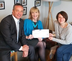 Rachel Deaville presents a cheque to Katie Tams of the Donna Louise Trust, Tree Tops Hospice. Chris Belyavin looks on.