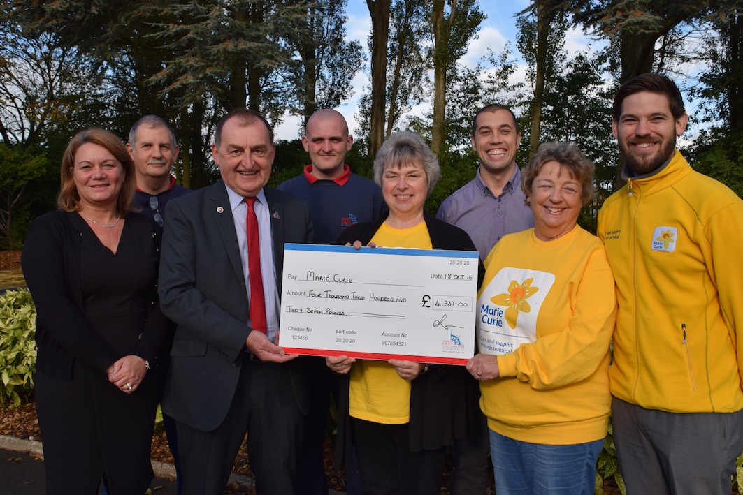 Marie Curie Cancer Support receives a cheque from Colwyn Bay Crematorium. L/R Gary Evans of Conwy CBC, Rosemary Williams of Marie Curie and Andy Barlow, crematorium Technician.