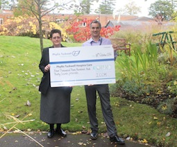 Peter Foxton of Phyllis Tuckwell Cancer Care receives a cheque from Kelly Chambers of Aldershot