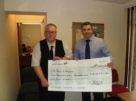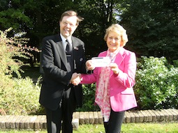 Charles Howlett of Chilterns crematorium presents a cheque to the Trevor Collins Foundation