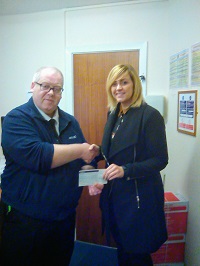 John Percival (Crematorium Technician) of Walton Lea Crematorium handing over the cheque to Mrs Chris Holt (John Holt Cancer Support Foundation).